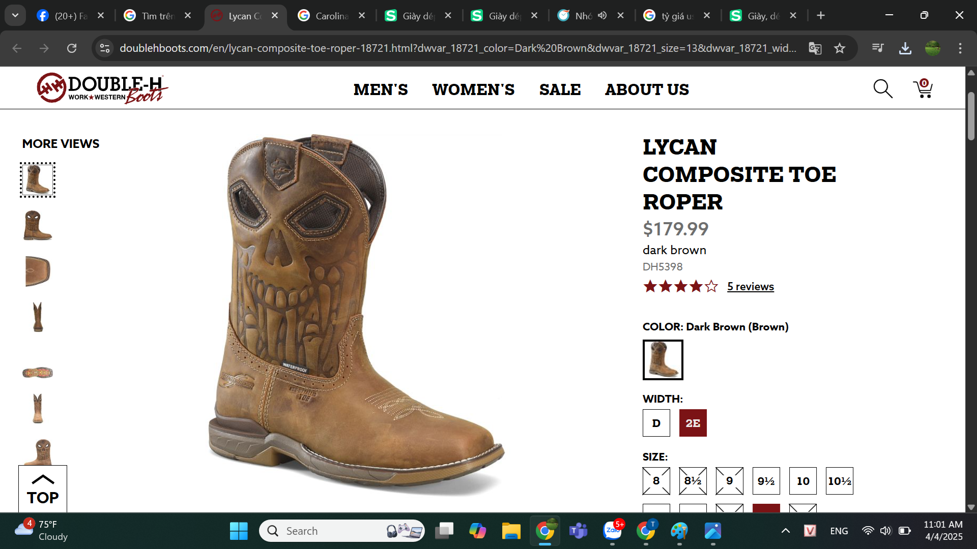 Giày bảo hộ nam, giày đi xe PKL, giày đi phượt da bò thật, chống nước, mũi bọc thép, đế cách điện và chống đinh chính hãng Brand: Double-H Boots Lycan Composite Toe Roper- Giày xuất dư Mỹ