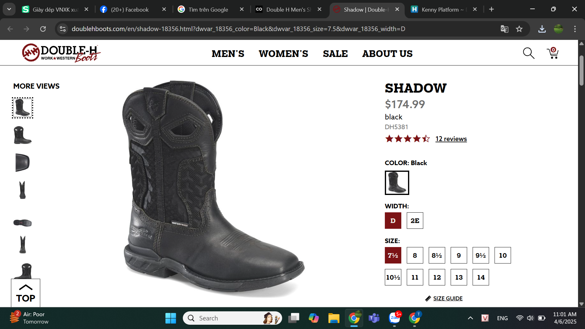 Giày bảo hộ nam, giày đi xe PKL, giày đi phượt da bò thật, chống nước, mũi bọc thép, đế cách điện và chống đinh chính hãng Double H Men's Shadow Waterproof Performance Western Boots - Broad Square Toe - Giày xuất dư Mỹ