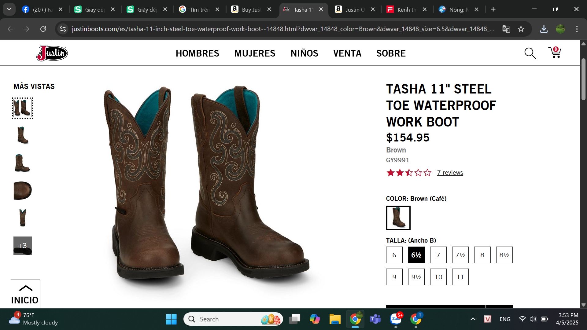 Giày bảo hộ nam, giày đi xe PKL, giày đi phượt da bò thật, chống nước, mũi bọc thép, đế cách điện và chống đinh chính hãng Justin Tasha 11" Steel Toe Waterproof Work Boot - Giày xuất dư Mỹ