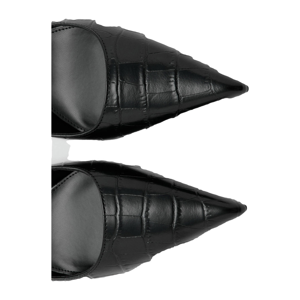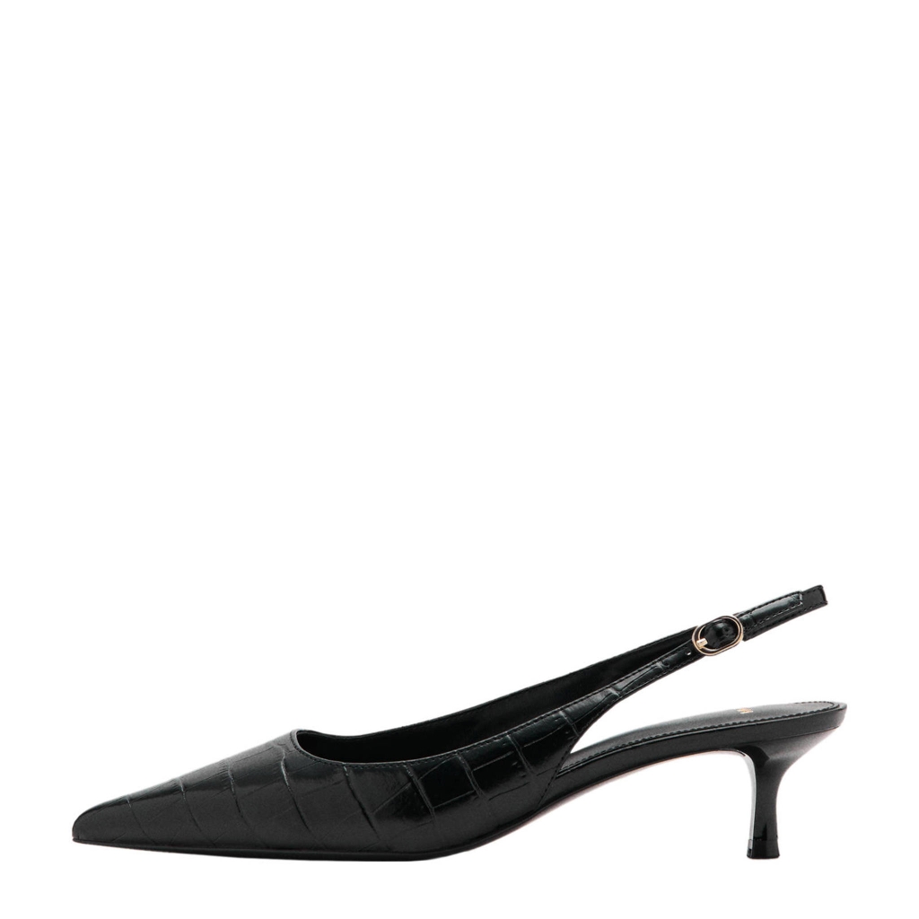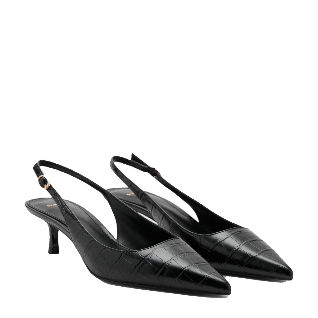 Đôi giày cao gót nữ M.N.G sở hữu thiết kế slingback (hở gót) thời thượng, kết hợp cùng chất liệu da vân cá sấu (croc embossed) sang trọng. Tone màu đen huyền bí giúp dễ dàng phối hợp với nhiều phong cách – từ công sở thanh lịch đến dạo phố cá tính.
