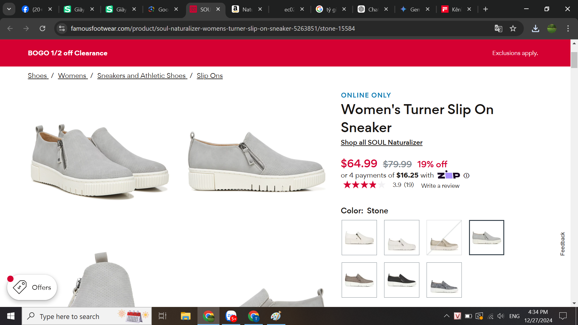 Giày Sneaker Nữ Nữ SOUL Naturalizer Women's Turner Slip On Sneaker Color Stone - Giày nữ xuất khẩu Âu, Mỹ